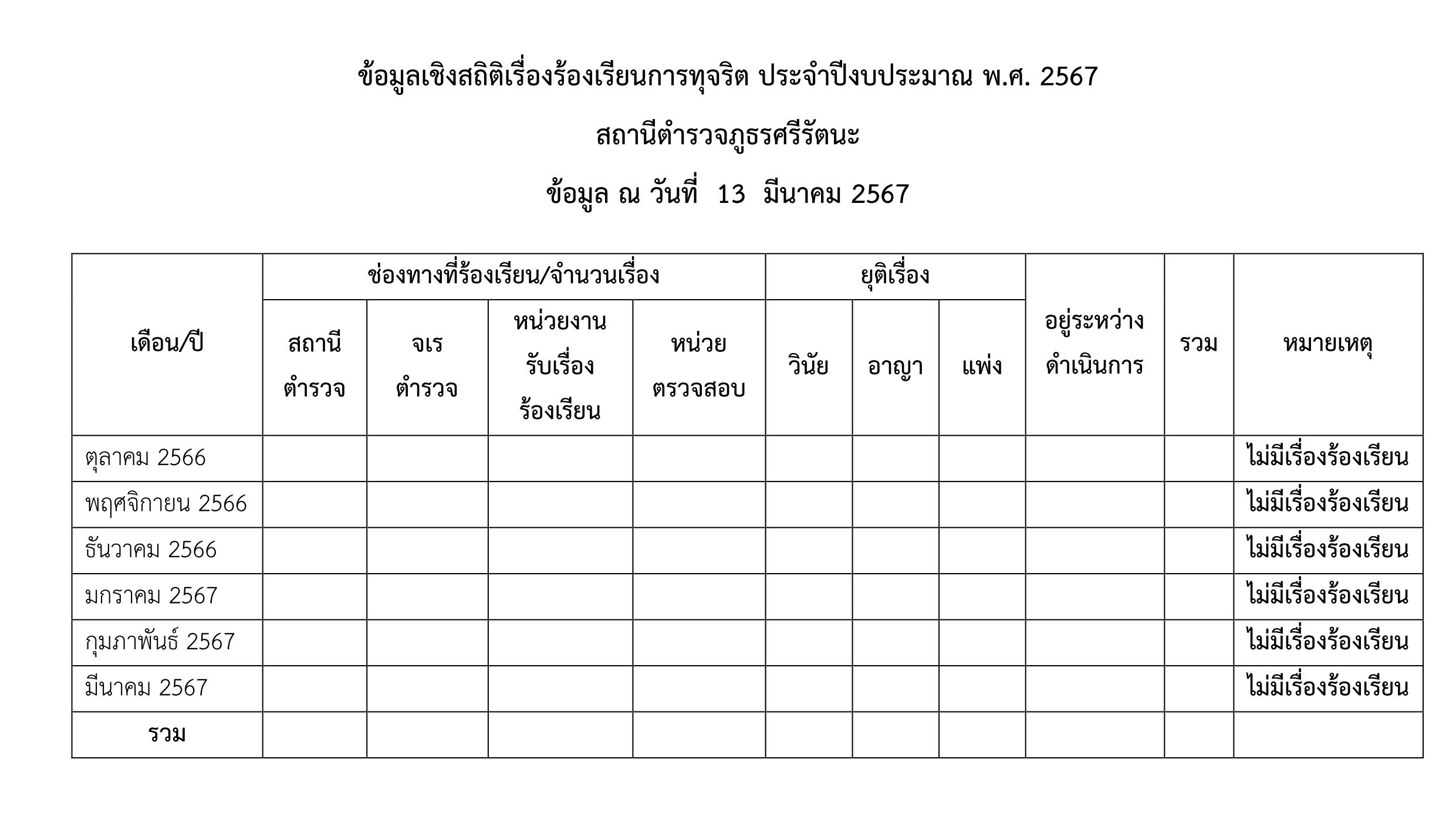 O17 ช่องทางการแจ้งเรื่องร้องเรียนการทุจริต 12 มีนาคม 2567 โดย admin / ITA 2566,ITA 2567 Views: 200 ช่องทางการแจ้งเรื่องร้องเรียนการทุจริตและประพฤติมิชอบของเจ้าหน้าที่ของสถานีตำรวจ ข้อมูลสถิติเรื่องร้องเรียนการทุจริตและประพฤติมิชอบ ของเจ้าหน้าที่ของสถานีตำรวจ ข้อมูล ณ วันที่ 14 มี.ค.67 FacebookFacebookXXLINELine